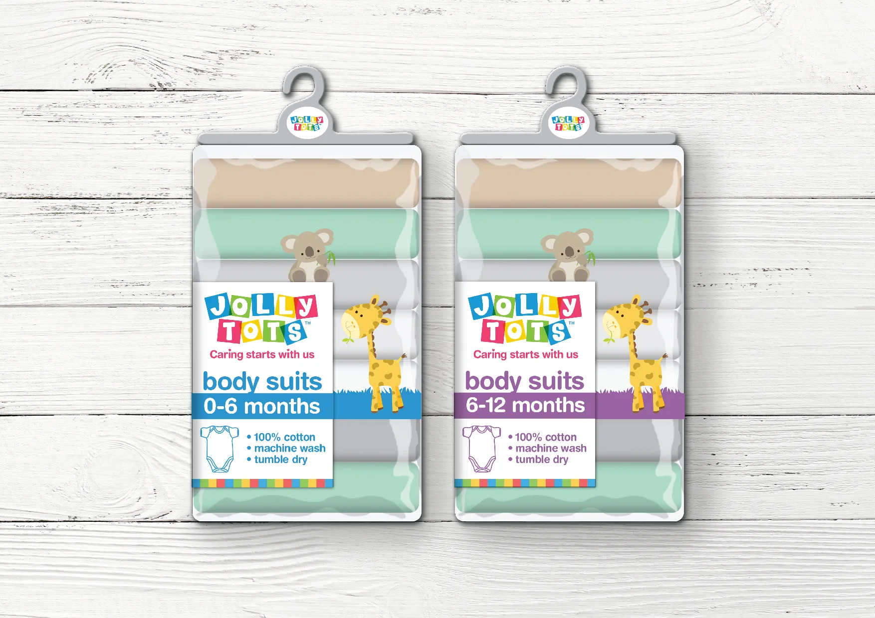 Jolly Tots is a brand by Dairy Farm (Hong Kong) targeted for babies aged 0-2 years. It includes both clothes and baby accessories. The existing branding was too busy, not approachable enough and lacked impact on shelf.