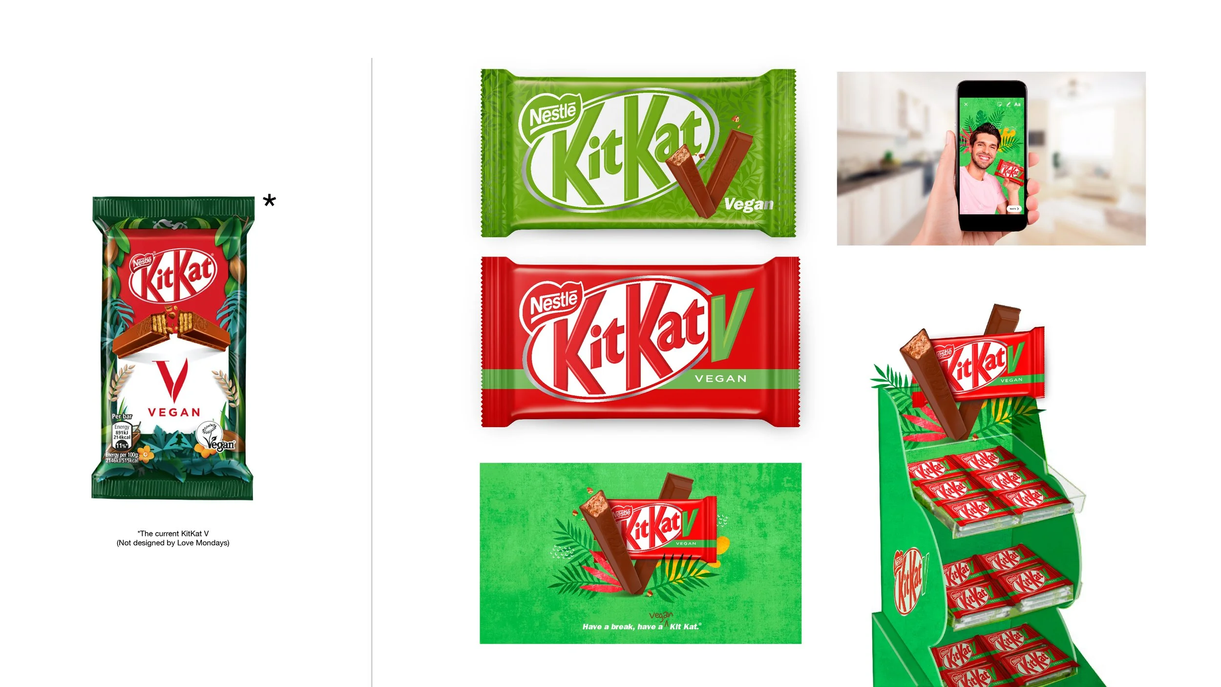 When Love Mondays saw the design that was initially launched, it raised a lot of questions and we felt like there was way more potential to be unlocked. Why should KitKat V resemble a diet product with less taste appeal? Why should the brand be diluted? Why should it look like a taste variation from the parent brand? KitKat V should appeal to the mainstream who are looking to reduce their overall meat and dairy intake.